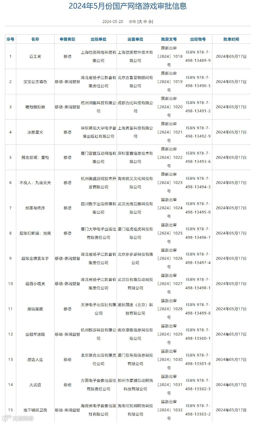 具体来看5月获得版号的游戏中,笔者认为有这些值得我们重点关注:四三九九《疯狂普拉斯》《最终坚守》、恺英网络《百工灵》、柠檬微趣《梦幻旅行》、汉家松鼠《对决!剑之川》、灵犀互娱《神探诡事录》、祖龙科技《踏风行》、成都力比科技《鞭炮模拟器》、雷霆游戏《搏击双城:重构》、武汉光线互娱《部落与秩序》、中青宝《米拉加尔战记》《像素战神》《星耀美美》、嘉丰永道《街头极限跑酷》、风眼科技《脑洞大侦探》、禅游科技《指尖连一连》以及几款知名IP游戏《不良人:九幽玄天》《我叫MT:口袋守卫战》《三国之乱世为王》《功夫熊猫:神龙大侠》等。