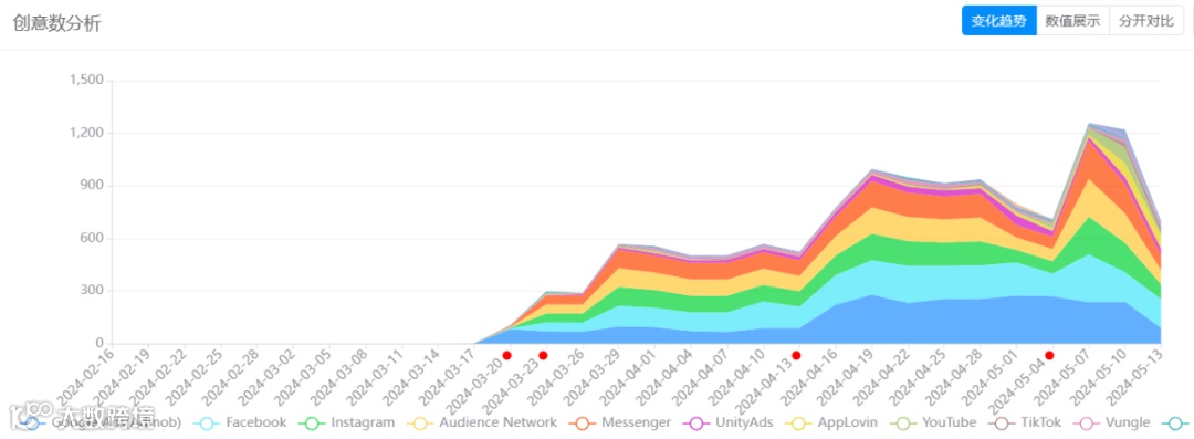 从投放时间上看,是从3月中旬开始预热,大量投放集中在上线前半个月,游戏全球上线前一天(5月7日)为投放量最高峰。近几日素材投放放缓,恢复较为平稳的投放节奏,为游戏的稳定长线运营做准备。