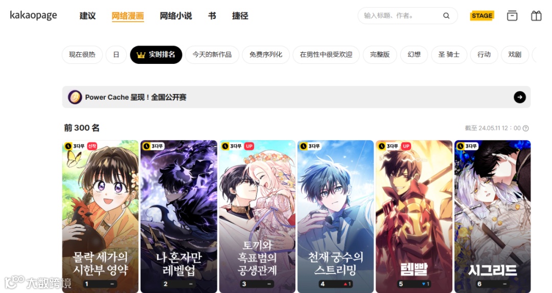 再从小说剧情来看,对比同类型的中国网文小说,其实《我独自升级》的剧情并不算太出色,甚至可以说是比较平庸的系统爽文小说,其IP的爆点主要是来源于漫画化的推动。《나 혼자만 레벨업(我独自升级)》早在2018年开始就连载漫画,仅在韩国网络漫画平台kakaopage就有4.8亿观看量,漫画全球点击量超143亿,时至今日仍能在实时排名里占据第2名的位置。除了靠着主笔Dubu个人酷炫的画风,在众多“双开门冰箱”中脱颖而出,成功征服了各个国家和地区的观众口味,韩漫整体的飞速发展也起到了重要的推动作用。
