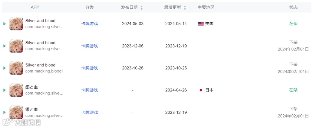 2023年10月底,也就是在《Watcher of Realms》公测后,沐瞳在美国及日本市场测试了一款名为《Silver and blood》(日服名称《銀と血》)的二次元卡牌游戏(仅上架Google Play),测试时间仅维持了一周左右。