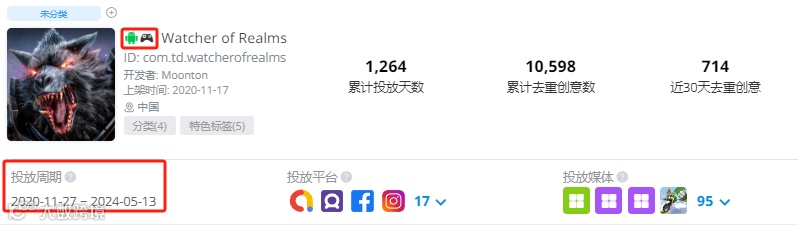 值得注意的是,虽然该作收入已不尽如人意,但在最近四年半的时间里,其安卓端严格去重后投放的素材数仅有380,苹果端更是只有2。该数据除了印证游戏70%以上的收入来自Google Play的合理性,也说明除了人力成本与分成,《Magic Rush:Heroes》大部分收入都可以算是纯利润。