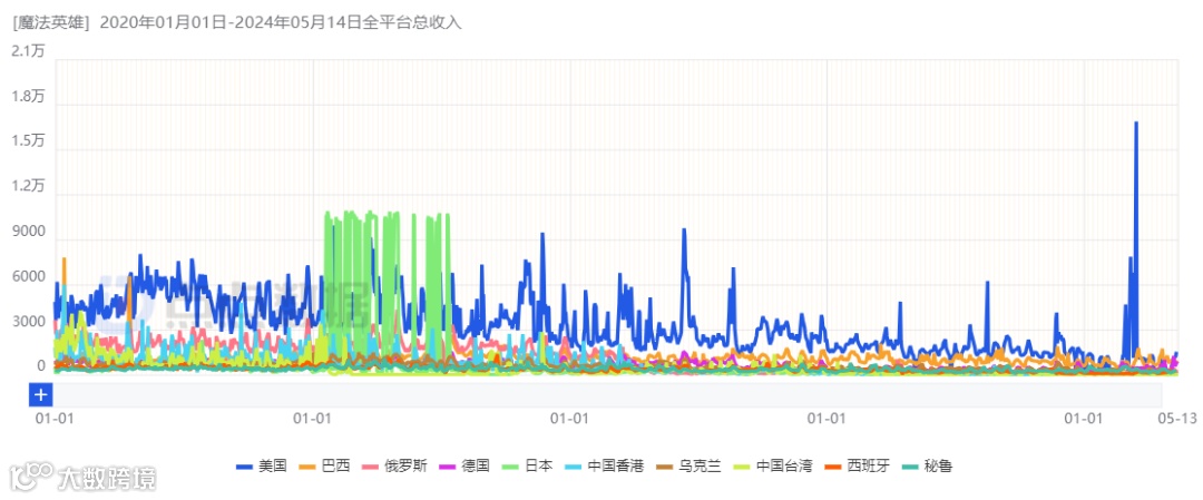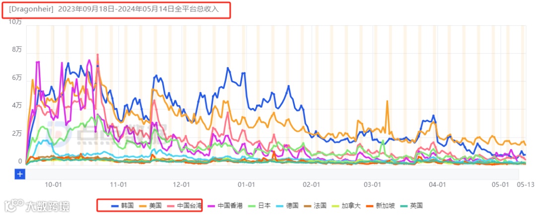 截至目前(5月14日,下同),《Watcher of Realms》公测正好10个月,近一个月流水达6360万,双端累计总流水预估为4.97亿元,美国、德国、法国以45.82%、9.45%以及5.1%的贡献居于前三,韩国、中国香港以及日本虽然上线不到两个月,但占比排名也已经分别来到了六、七、八名,收入趋势明显回暖。