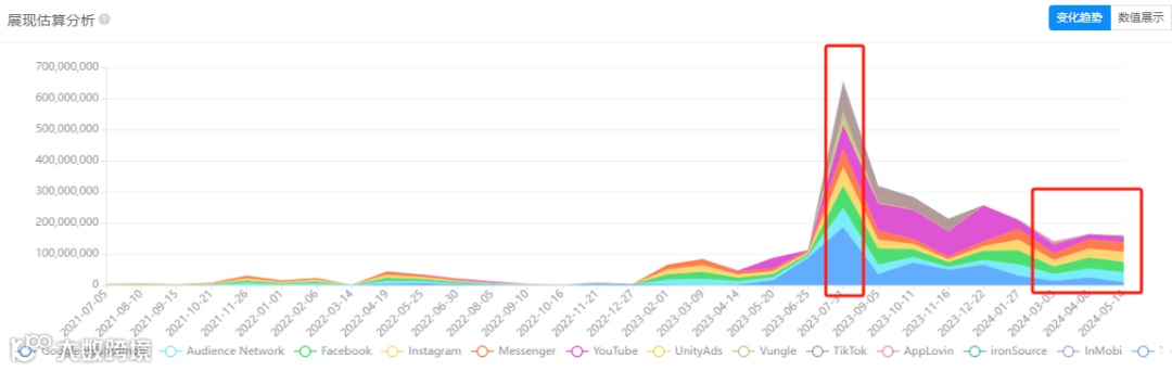 起量时间同样在6月下旬,7月去重后素材为4612,环比增长200%以上,8月投放力度同样开始下滑,9月之后月投放恢复至2500-1500之间。2024年3月上线新增市场后,月去重素材量依然不超过2500。