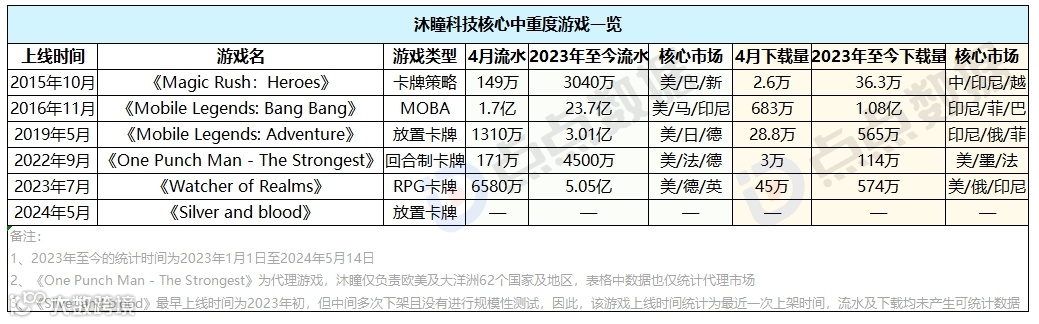 那么,《Watcher of Realms》是一款怎样的游戏?到底为何“再焕新生”?除了该作,沐瞳这些年上线了哪些游戏?表现如何?未来其赛道布局又是如何?下文中,点点出海将结合下表对上述问题进行分析与拆解。