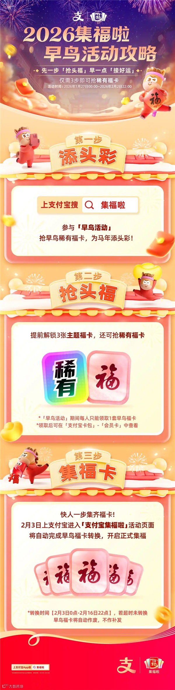 当前为“早鸟活动”阶段(1月27日至2月2日),参与者可抢先领取一套早鸟卡,包含稀缺的万能稀有卡。2月3日正式开启后,早鸟卡将自动转化为正式福卡,进入集福流程。