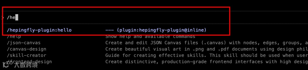 Claude Code 启动后,就能够加载出来我们的插件了。敲个斜杠就能联想出我们插件的名字。