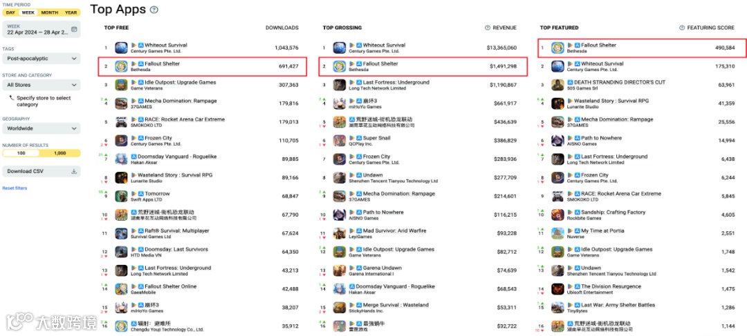 最终,《辐射避难所》攀升至末世题材类手游排行榜榜首,并已保持了两个多星期。在此期间,该游戏一直是最受关注的游戏之一,收入和下载量均排名第二。然而,值得注意的是,《寒霜启示录(Whiteout Survival)》还是站稳了脚跟,经受住了热点IP的威胁,并维持了领先地位。