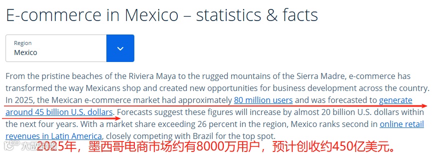 墨西哥电商市场已连续六年保持双位数增长。2024年电商交易额达7897亿比索(约431亿美元),同比增长20%,预计2025年将突破450亿美元,位列全球电商增速前五。