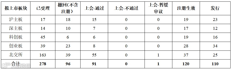 截止2025年12月31日,年度IPO受理数量为278家(其中沪主板17家,科创板45家、深主板14家、创业板39家、北交所163家)、撤回数量为96家、上会92家(其中,通过91家)、120家获得发行批文、110家成功发行上市。