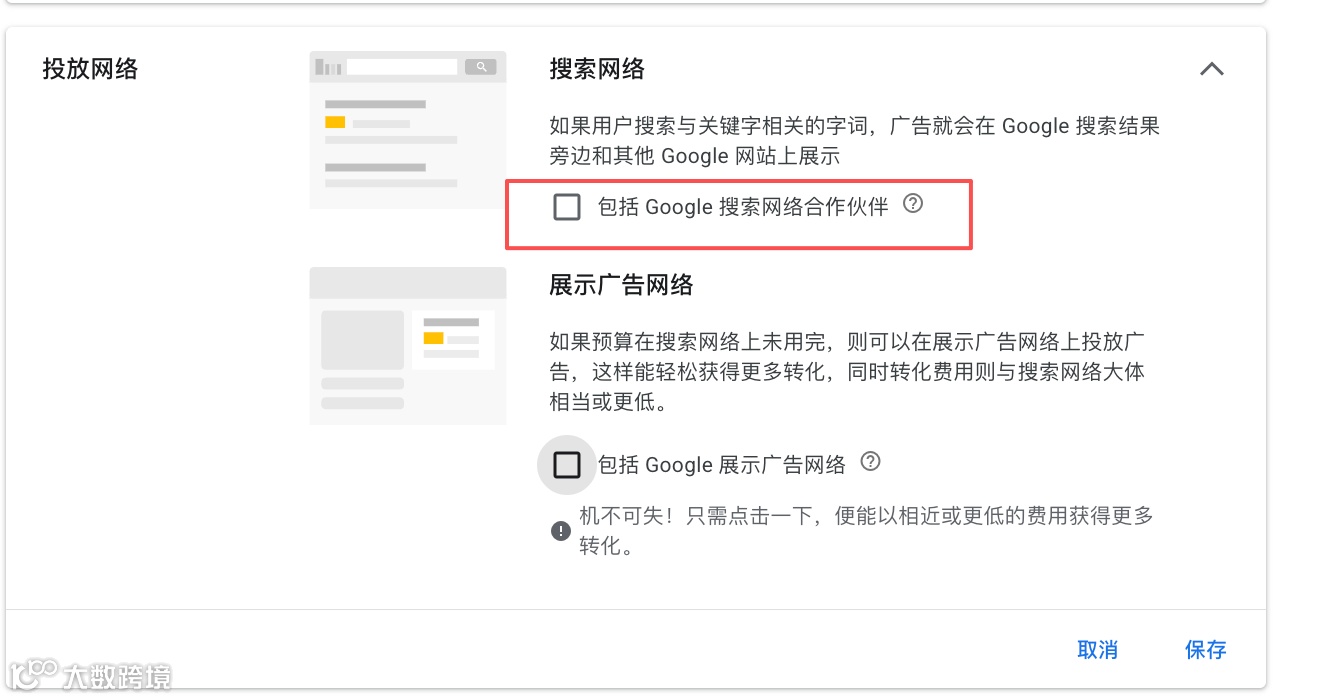 回头检查广告设置,真相大白:大部分广告预算都流向了“搜索网络合作伙伴”版位。在我们暂停该版位后,登录成功率随即回升。