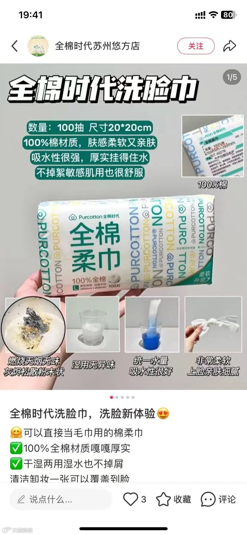 “全棉时代的全棉柔巾真的是敏感肌福音!每天早上用它擦脸,柔软度满分,完全不会泛红……这款全棉柔巾我已经空盒N次了,全家都爱用!”