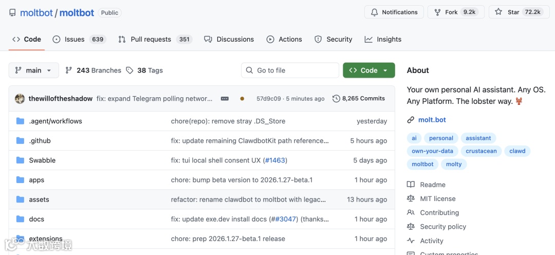 Moltbot GitHub Star数已达72.2k,是当前最热门的开源AI智能体之一,被称作“开源版贾维斯”。
