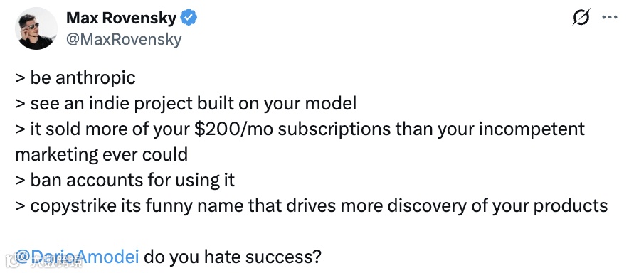 更名事件引发开发者广泛质疑。有用户在𝕏平台公开质问Anthropic CEO Dario Amodei:“是不是见不得别人成功?”