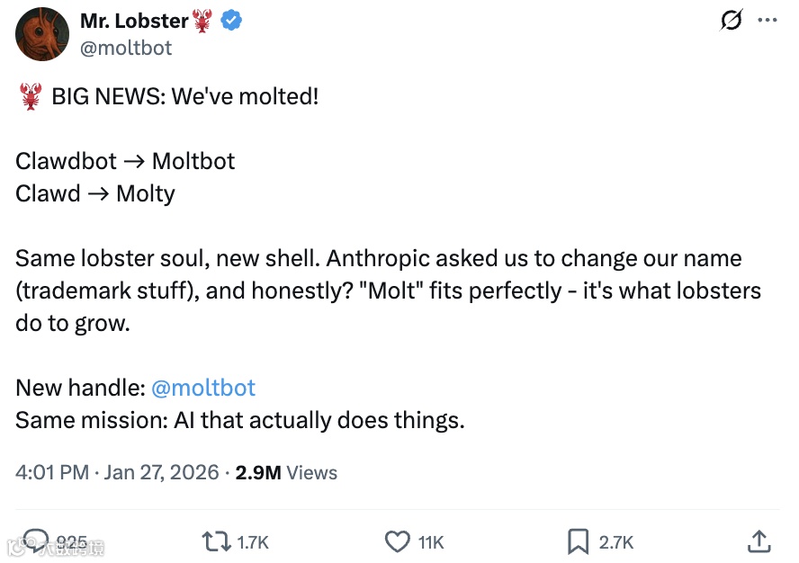 Peter表示已核查,“Clawdbot”未被注册为商标,法律上可用。但Anthropic仍发出正式主张,甚至禁止其改用近似名“Clawbot”。最终,项目更名为Moltbot,取意龙虾蜕壳(Molting),延续生物隐喻,同时规避侵权风险。