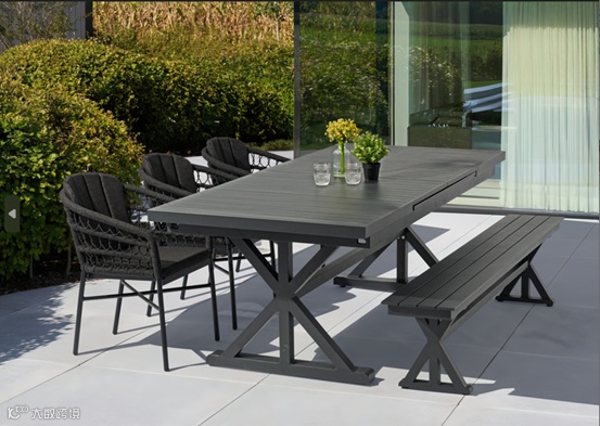 Ramiro系列融合现代简约与实用性,黑灰配色简洁高雅。铝合金框架搭配奥利芬绳带,适合户外使用。长桌可从2.2米×1米扩展至3.2米×1米,满足多人聚餐需求。软垫座椅与宽敞桌面提升舒适性与功能性。