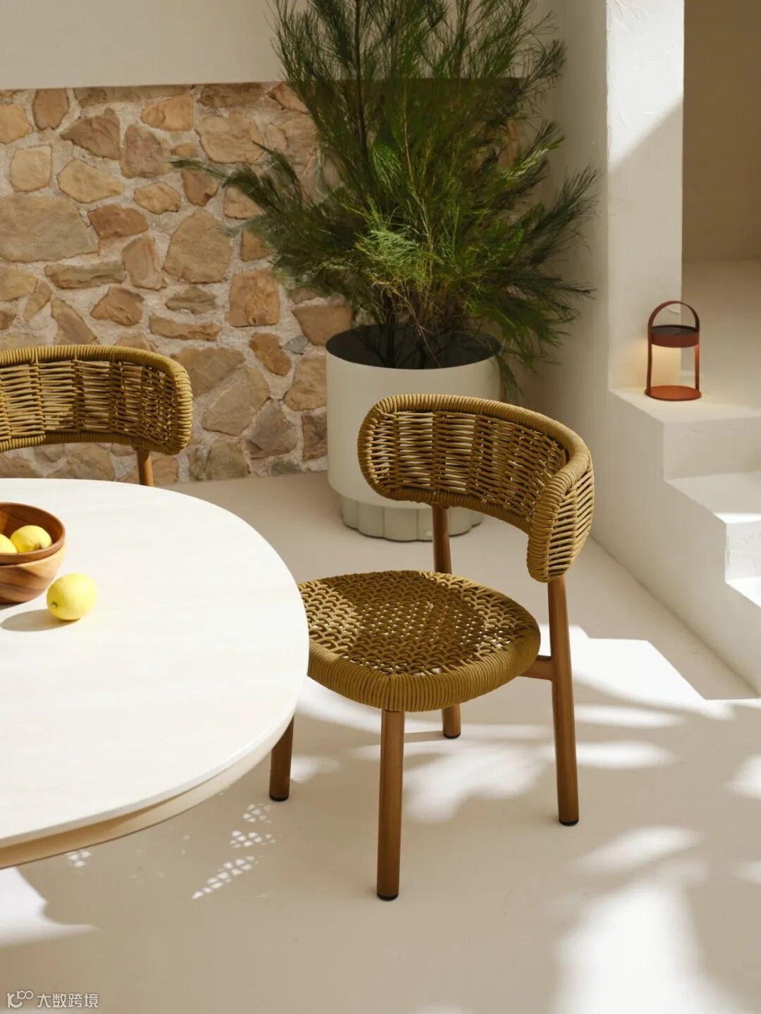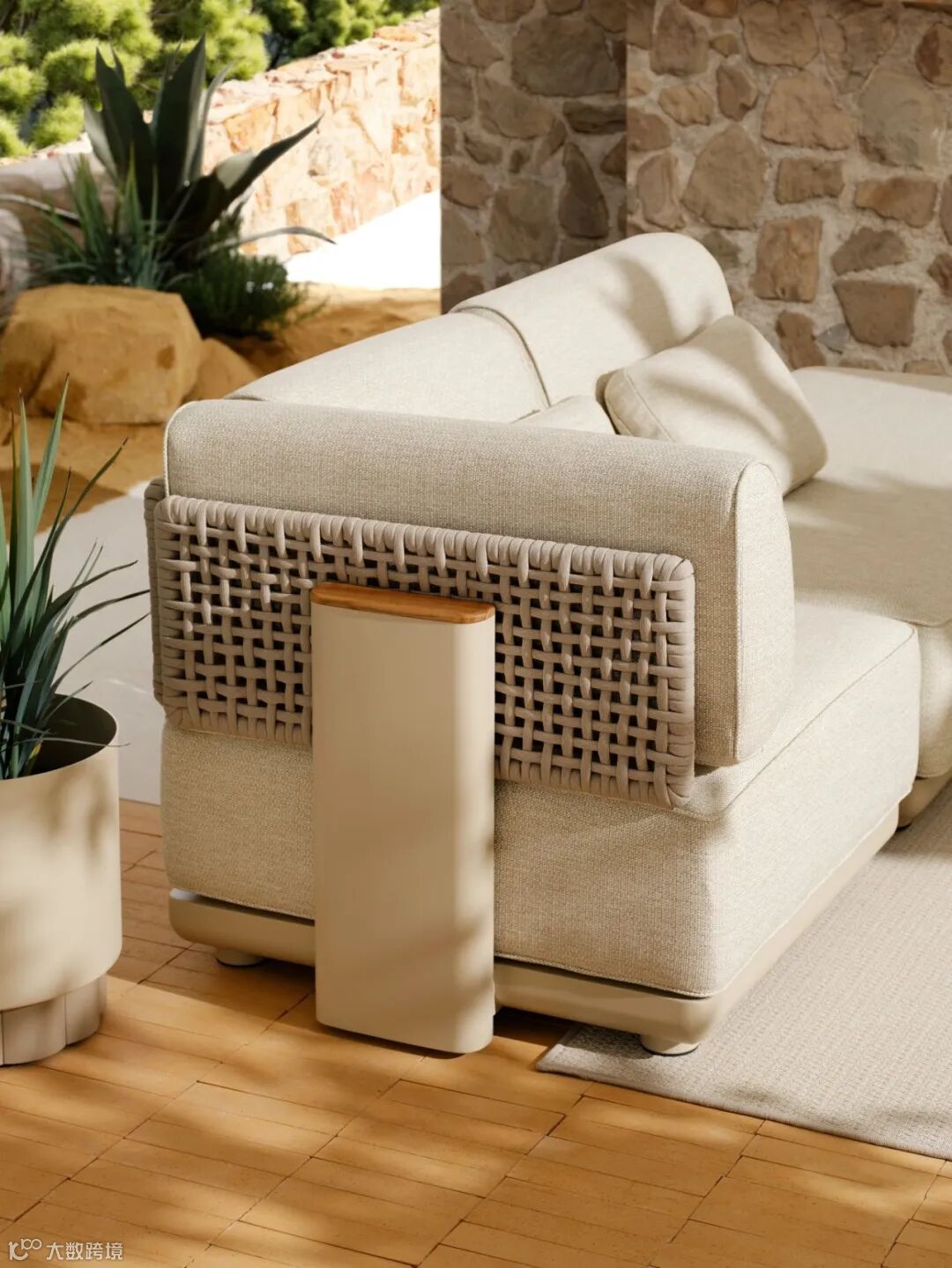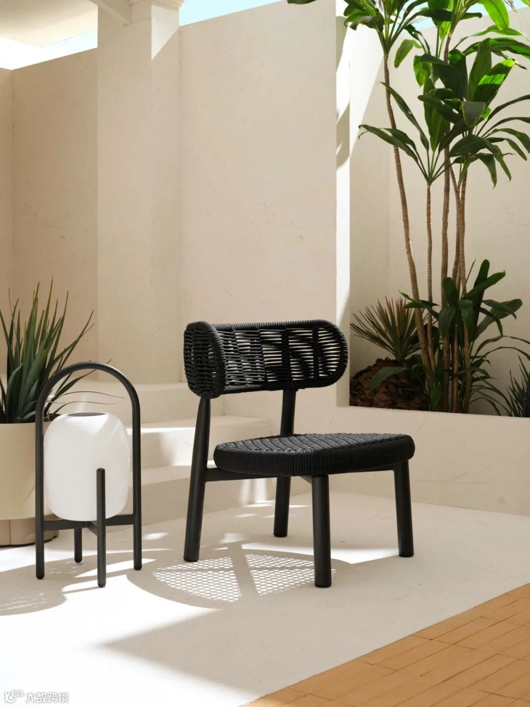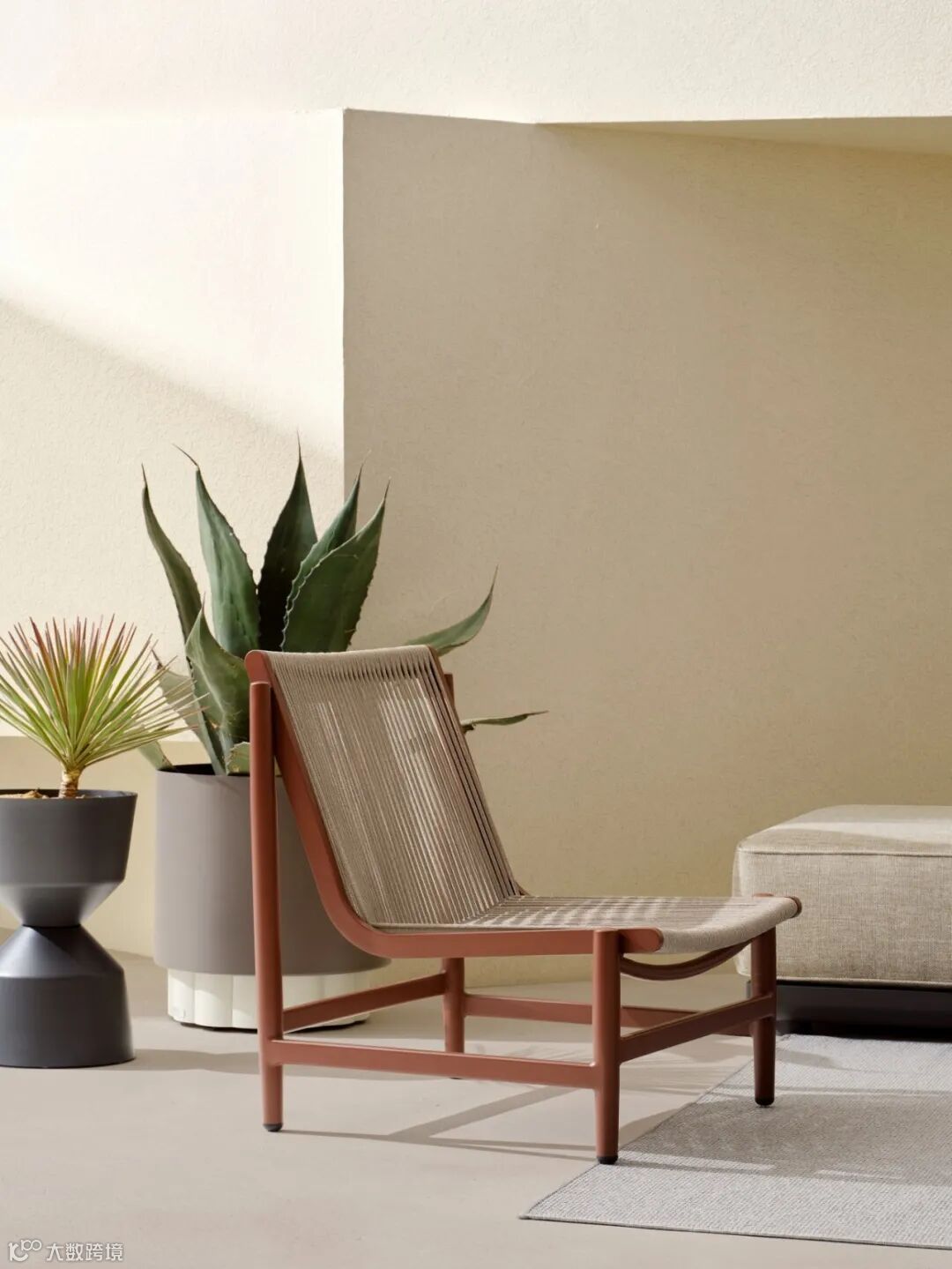 由柚木、绳与象牙白铝管组合而成,扶手包裹式设计形成独特视觉IP,适用于酒店大堂、邮轮空间、庭院及室内客厅。