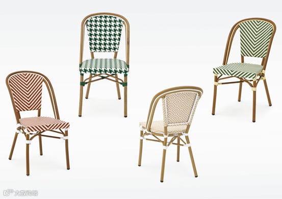 FELIX灵感源于法式咖啡馆椅,结合现代改良。藤编座椅与靠背搭配简洁线条与铝合金框架,体现经典与现代融合。几何图案与多色选择(绿、红、米色)增强视觉趣味。新型合成材料耐候性强,弧形座椅与良好支撑保障长时间舒适体验。