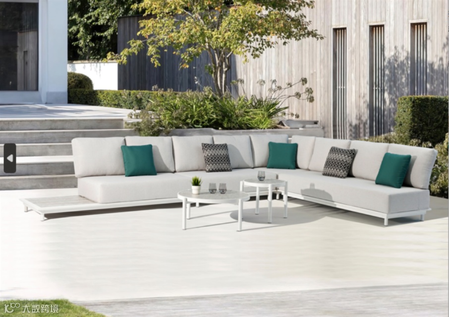 Kathleen系列强调现代简约与功能性结合。铝合金框架轻便坚固,高性能户外面料具备防水、防晒、防霉特性。线条简洁流畅,搭配多彩靠垫提升视觉趣味与舒适度。模块化设计支持自由组合,低矮桌与宽座椅打造理想社交放松空间。