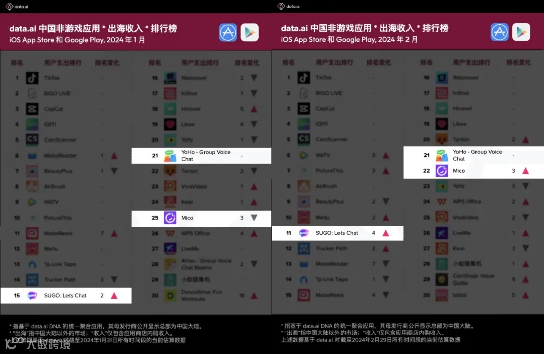 2024年第一季度,公司进一步稳固泛人群社交业务在中东北非的领先优势,SUGO等后发产品延续增长态势,进一步扩大规模,在data.ai发布的中国非游戏应用出海收入排行榜中排名持续攀升。