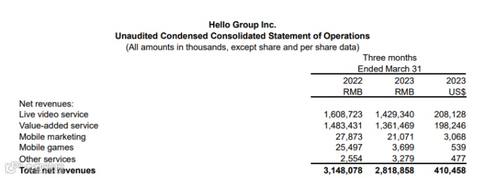 这是挚文集团营收连续下滑的第十三个季度,也是其取得盈利的第三十三个季度。从收入角度来说,挚文集团各项业务收入均呈现下滑态势,其中,直播视频服务收入为14.293亿元人民币,相比去年1季度16.087亿元人民币的收入下降11.2%,增值服务、营销、游戏部分同样出现不同程度下跌。