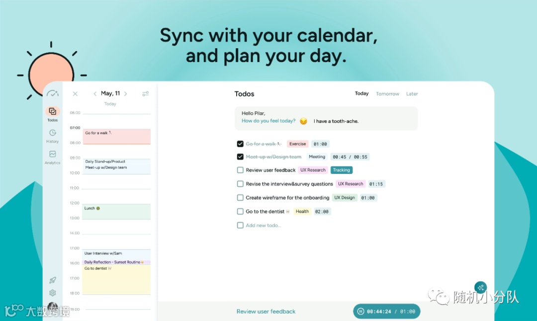 BeforeSunset 的核心功能是通过同步用户的日历和待办事项,为用户创建出最优的日程安排,甚至可以自动化地为用户创建子任务,或将待办事项转变为可执行的任务。BeforeSunset还提供了分析功能,用户可以查看自己一周内的工作效果,并根据这些信息进行有意识调整,以提高效率。