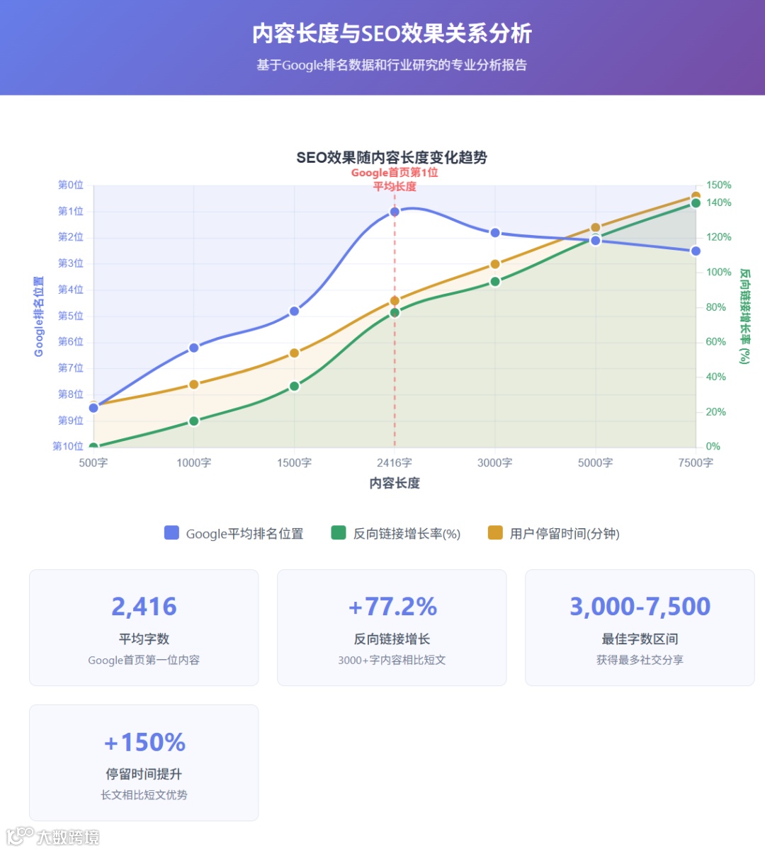 重要研究发现:Google首页排名第一的内容平均达2,416字,3,000-10,000字的文章获得最多社交分享,并多出77.2%的反向链接。