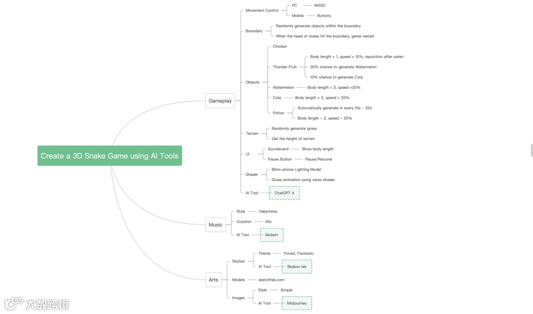 其中,游戏制作过程中大部分指令和编写代码、动画特效、着色器等部分均是通过与ChatGPT进行对话来完成,音乐通过mubert.com这样的音乐生成AI完成,最后则是通过AI绘图工具来创作背景画面和角色。在历时2个小时后,一款3D版贪吃蛇被成功制作出来。