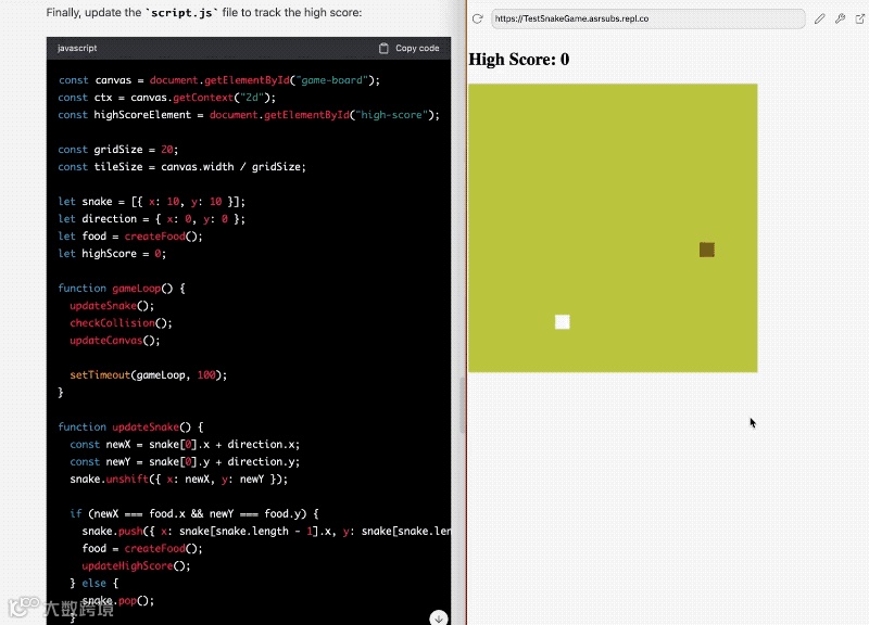图源:推特 Ammaar Reshi @ammaar利用ChatGPT制作的贪吃蛇游戏