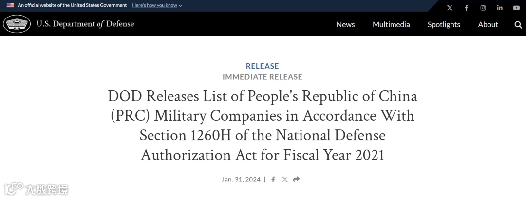 第1260H条款源自美国《2021财年国防授权法》,全称为“Section 1260H of the William M. ('Mac') Thornberry National Defense Authorization Act for Fiscal Year 2021”。该条款授权美国防部长识别在美国境内或境外运营的所谓“中国军事企业”并列入清单。