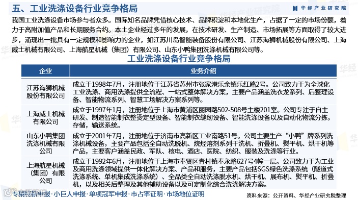我国工业洗涤设备市场呈现国际品牌与本土企业并存格局。国际品牌依托核心技术、品牌积淀与本地化生产能力,主攻高附加值产品与长期服务合约;本土企业快速发展,在技术研发、制造工艺与市场覆盖方面进步显著,代表性企业包括江苏海狮机械股份有限公司、上海威士机械有限公司、山东小鸭集团洗涤机械有限公司、上海航星机械(集团)有限公司、江苏川岛智能装备股份有限公司等。