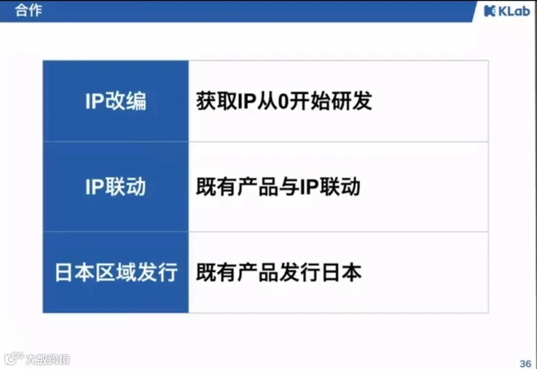 首先,获取手游IP、改编授权,从零开始做一个游戏。其次,如果开发者已有一款不错的游戏,KLab可以帮助其找到匹配的IP,借力IP或进行IP联动。最后,产品发行到日本,KLab也可以提供助力。