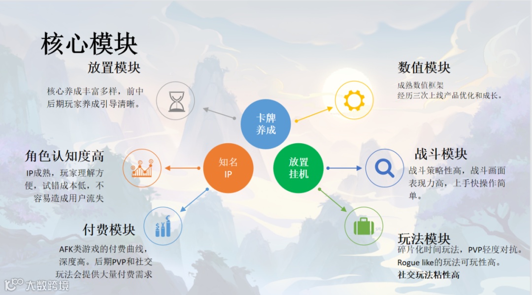 游戏在玩法上以卡牌养成和战前策略、roguelike这几个玩法为核心。我们的目标是卡牌养成,以数值为培养核心,因为其成熟度很高,上手也很快,后期的付费能力也很强,做强付费。放置挂机玩法简单,用来提升玩家留存。本身《妖神记》就有很庞大的粉丝基数,玩家对游戏中的人物都有了基础的认知,可以降低理解成本与买量成本,不容易出现流失现象。