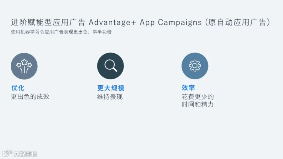 Advantage+ App Campaigns即进阶赋能型应用广告。与手动应用广告相比,能够通过机器学习提供更佳的优化成效,在展开大规模营销的同时维持稳定的广告表现,简化广告、创意管理的时间和精力,效率更高。