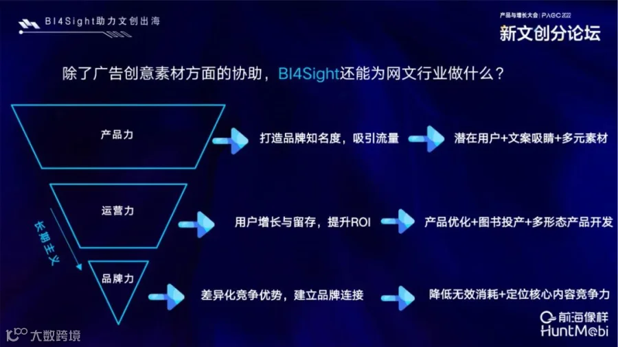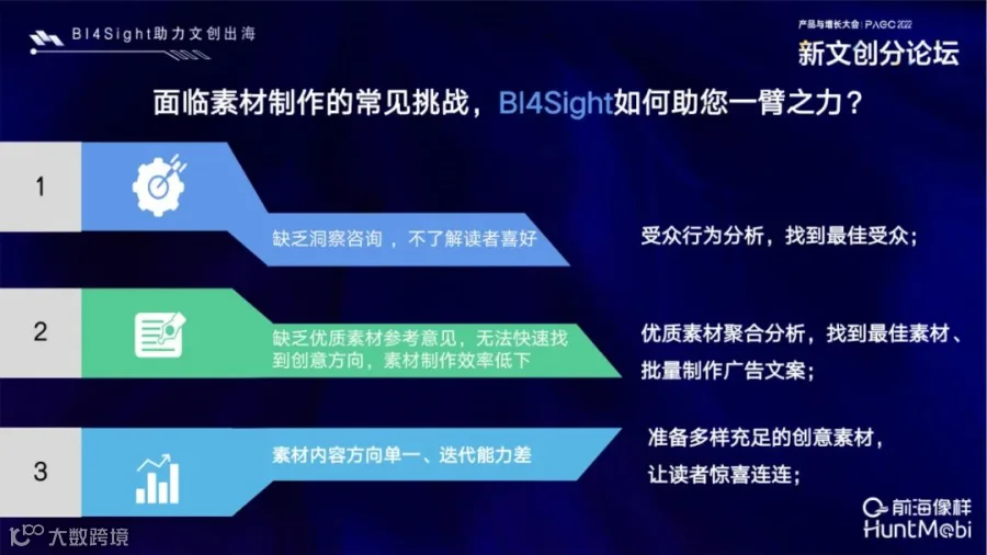 在这一过程中,HuntMobi自研的BI SaaS系统- BI4Sight可为出海企业用户增长提供全站式的科学营销管理服务。包括一是素材方面,BI4Sight系统可在受众的行为分析中找到优质的受众,明确付费用户目标;二是提供优质素材参考,如优质素材聚合的分析,从数据中进行元素的二级分类,进而进行文案和内容的批量创造;三是迭代能力,准备多样充足的创意素材,让读者永远会有惊喜。