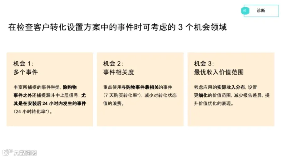 一是捕捉中上层信号。尤其注意除购物事件外,安装24小时内发生的其他事件;二是找到与多个与购物事件相关的事件;三是关心购物事件最优收入价值范围,考虑实际的收入分布,设置更细化的价值范围,减少报告差异。在提高转化量时,应考虑机会一、二,提高收入关注第三个机会点,包括实际收入的分配、细化的价值范围等。