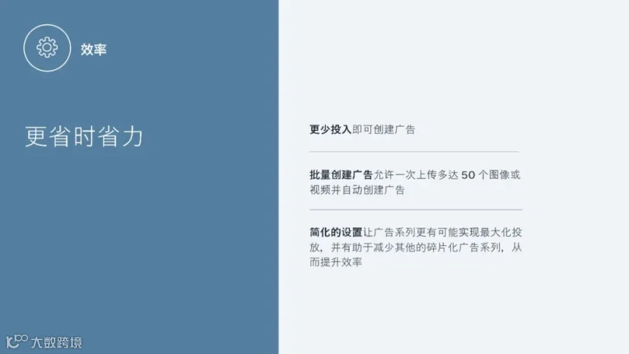 最后,效率方面。该系统可实现让广告主在广告创建中投入的设定更少,支持批量创建广告,一次上传最多可达50个图像复制视频,以及自动创建广告,实现更高效的广告创建过程,广告主有更大的机会实现投放最大化,有效减少其他碎片化广告系列,确保广告主具有更高的预算流动性、转化机会,从而达到最佳性能。