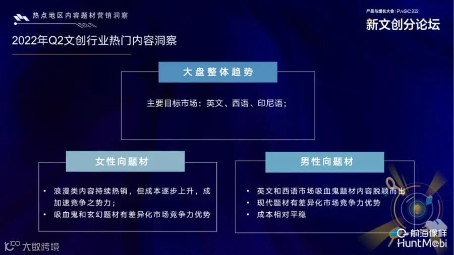 6月30日,2022PAGC产品增长大会聚焦新文创赛道开设线上分论坛,特邀Meta 大中华区业务总监 Tony Yin、Meta 大中华区产品营销经理 Vanessa Huang、Meta 大中华区中小企业业务总监 Deryck Yang、HuntMobi CEO Penny 、畅读集团 董事长 邹建峰、HuntMobi 业务合伙人 朱敏、书阅 创始人&CEO 于勐等多位文创内容行业重磅嘉宾,打破地域限制从内容文创前沿趋势以及新的市场挑战出发,分享如何才能追赶产品的创新与增长等热门话题,线上畅享行业新动态。