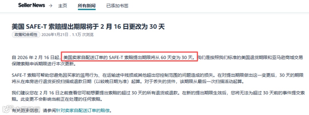 自2026年2月16日起,美国站自配送订单的SAFE-T索赔申报期限将从60天缩短至30天。