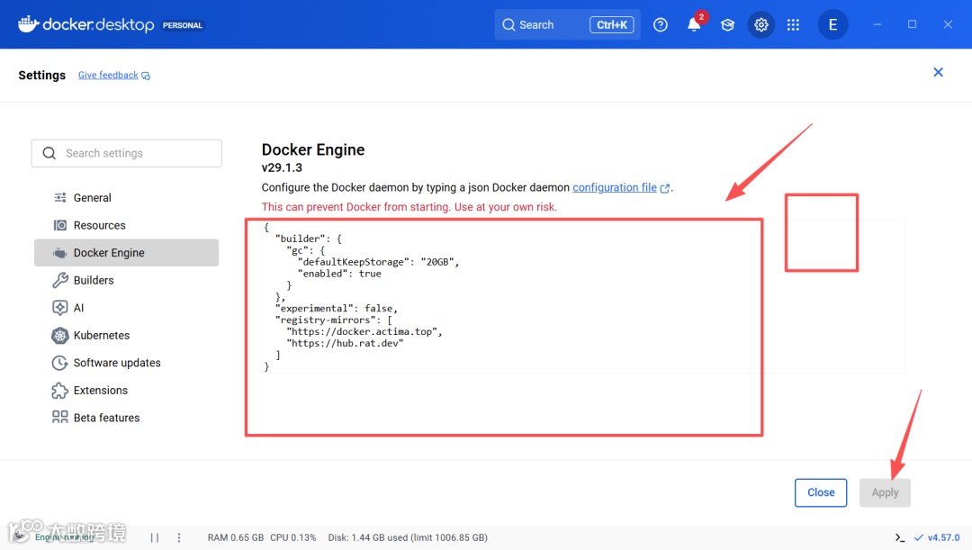 - 配置国服镜像源:进入Settings → Docker Engine,粘贴附件中