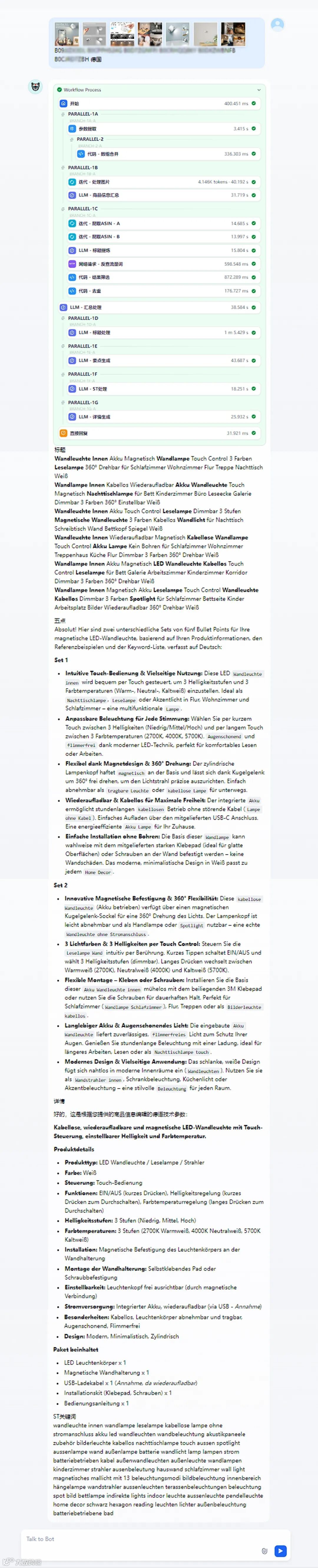 该AI工作流通过输入商品图片、参考ASIN及目标国家,全自动产出专业级商品详情页(Listing),完整复刻人工撰写流程,显著提升效率。