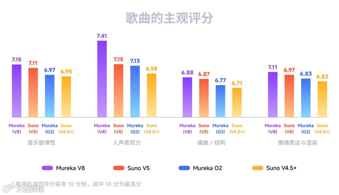 专业评测进一步验证其领先性:在演唱表现、旋律丰富度、和声编排、情感传达等维度,Mureka V8综合得分全面超越Suno V5。
