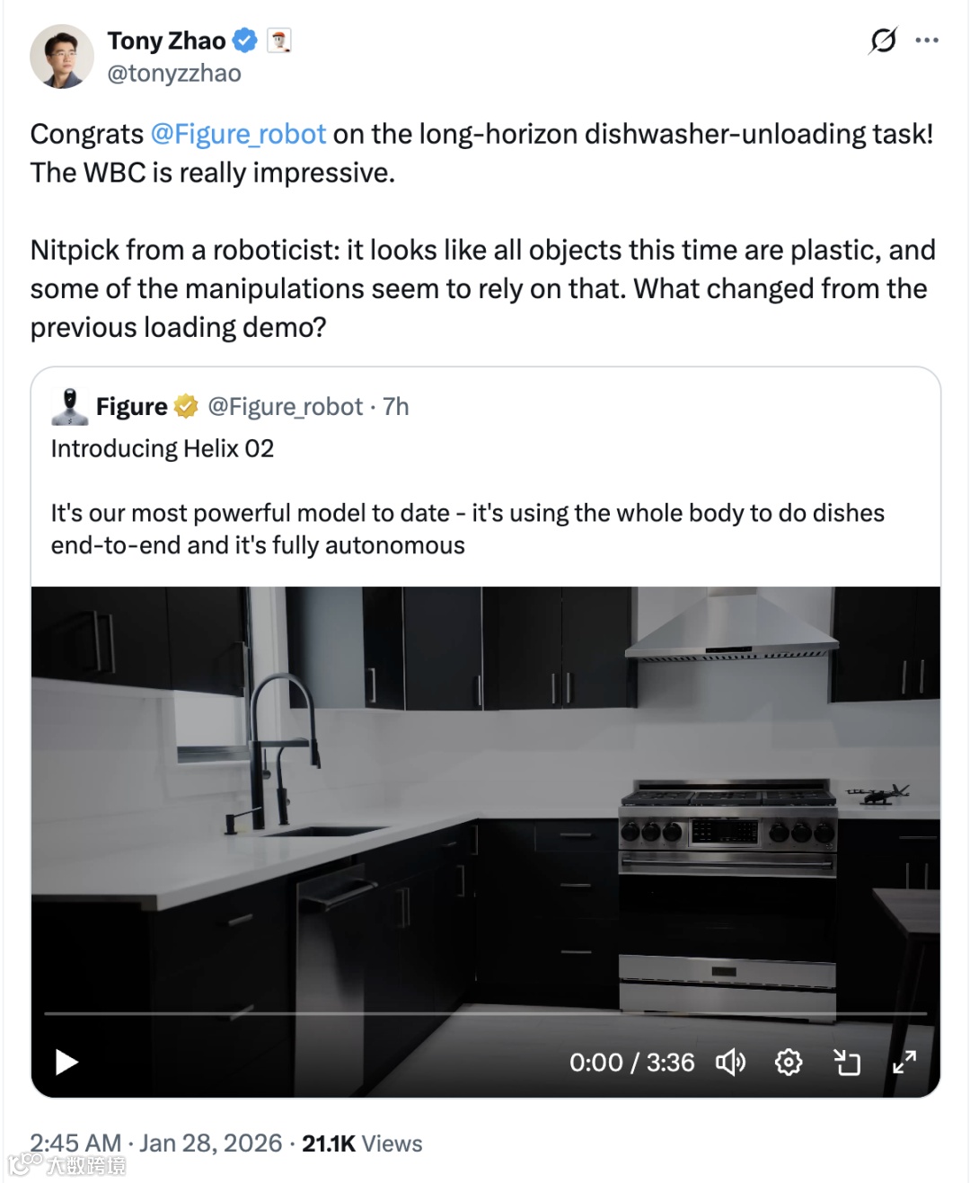 Sunday机器人创始人Tony Zhao评价:“恭喜@Figure_robot完成这个长时程的洗碗机卸载任务!全身控制(WBC)真的非常惊艳。”