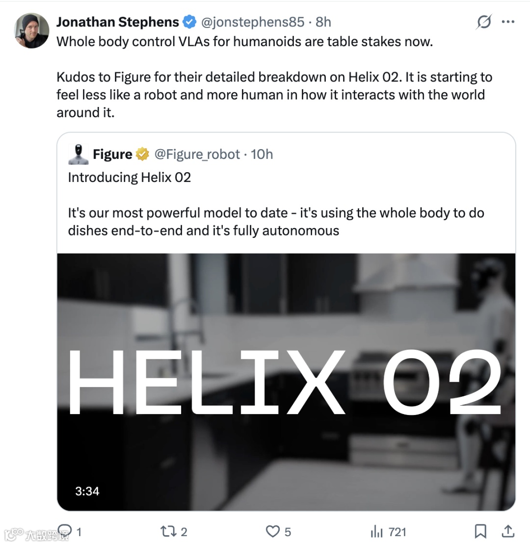 多位观察者指出:面向人形机器人的全身控制VLA,已成为行业新入场门槛;Figure对Helix 02的技术拆解,标志着机器人正从“工具感”向“具身感”演进。