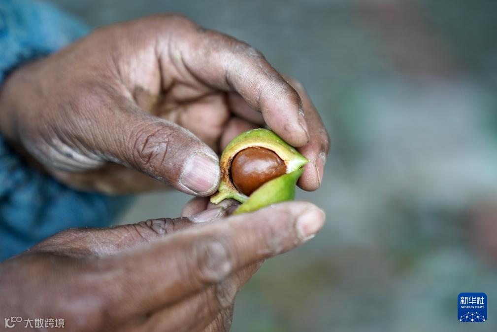 在科研基地查看坚果果实。新华社记者 彭奕凯 摄