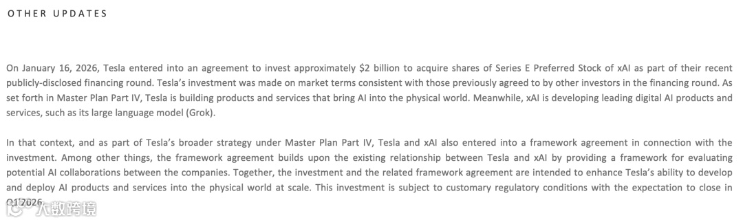 尽管利润承压,特斯拉仍推进重大战略协同。财报显示,公司已于2026年1月16日签署协议,将在xAI最新一轮融资中注资20亿美元,预计于2026年第一季度完成。
