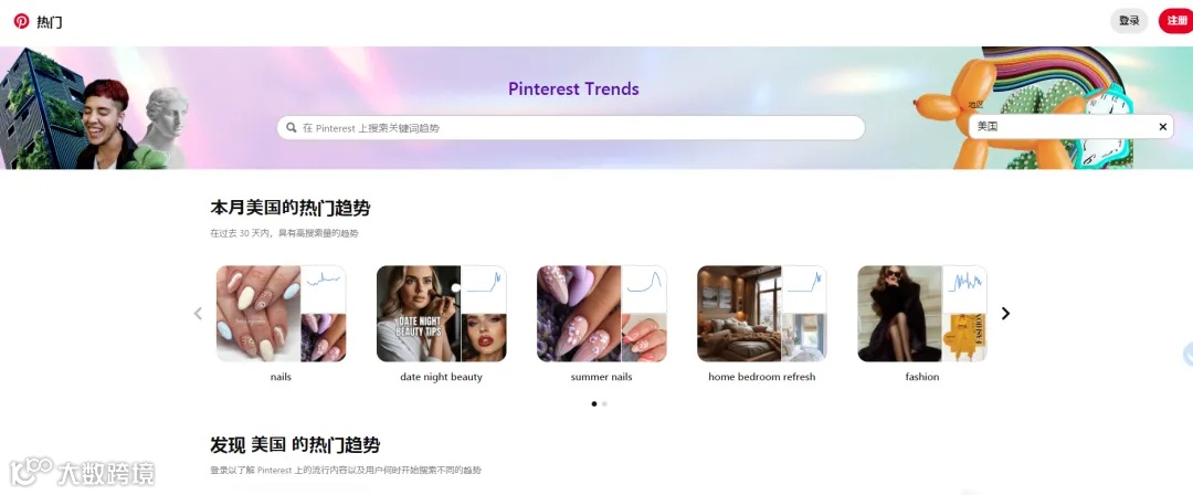 Pinterest趋势分析工具,适用于海外种草趋势捕捉与新品灵感挖掘。其内容生态与小红书高度相似,是选品前期重要的外部信号参考渠道。(注:需网络环境支持)