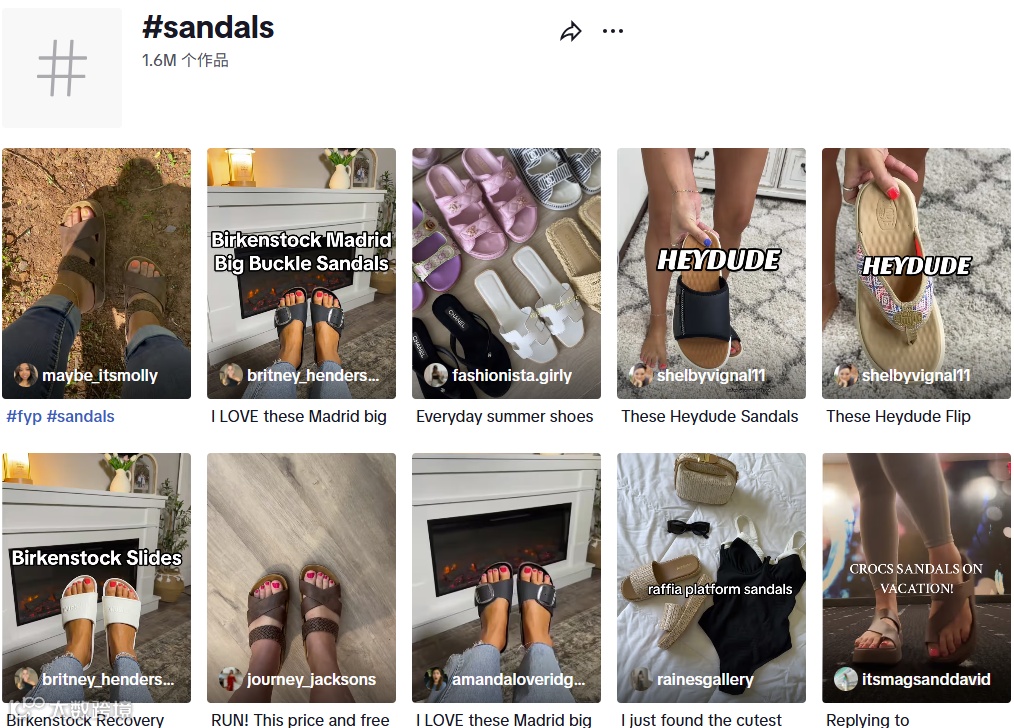 图源:TikTokTikTok上,#sandals标签下作品有160万条,随着夏季到来,热爱露营派对、海边度假的国外用户开始购买各种各样的凉鞋,并将真实测评发布到社媒,为大家提供购物参考。