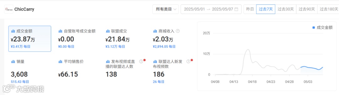 图源:kalodata这款海滩凉鞋是来自ChicCarry店铺产品。Kalodata数据显示,过去7天(5月1日—7日),ChicCarry海滩凉鞋销量达3608单,销售额达23.87万元。
