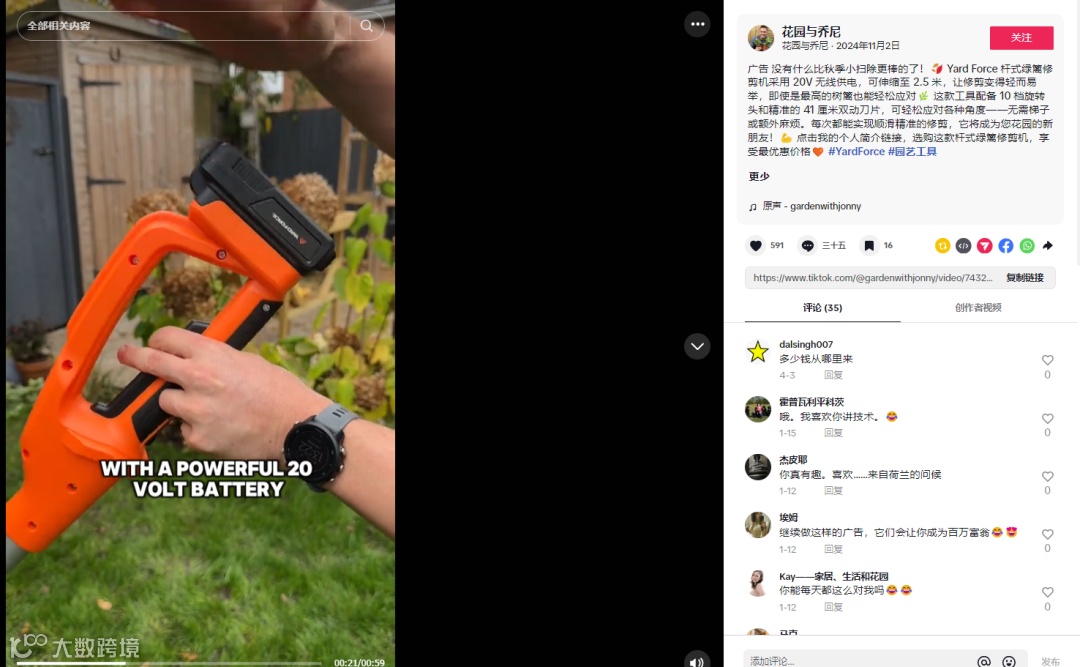 除了线下渠道,Yard Force还将视线聚焦线上社交媒体,进一步触达电商消费者。在Ins,品牌通过开设自营账号,发布产品画报和促销信息积累了超万名忠实用户;而在TikTok,Yard Force则是专注利用红人博主影响力帮助产品扩大声量。例如通过与腰部园艺领域博主合作发布推广视频,其园林修剪产品受到意向用户关注,实现精准流量转化。