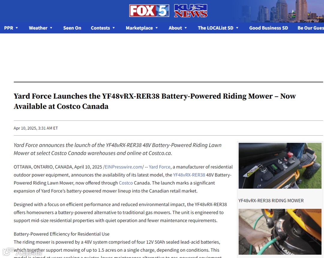 近期面向加拿大推出的骑乘式割草机新品就是通稿投放的最佳案例,该稿件被同步转载至全球知名综合新闻媒体DC NEWS和FOX 5等线上网站,有效为产品积累了热度。